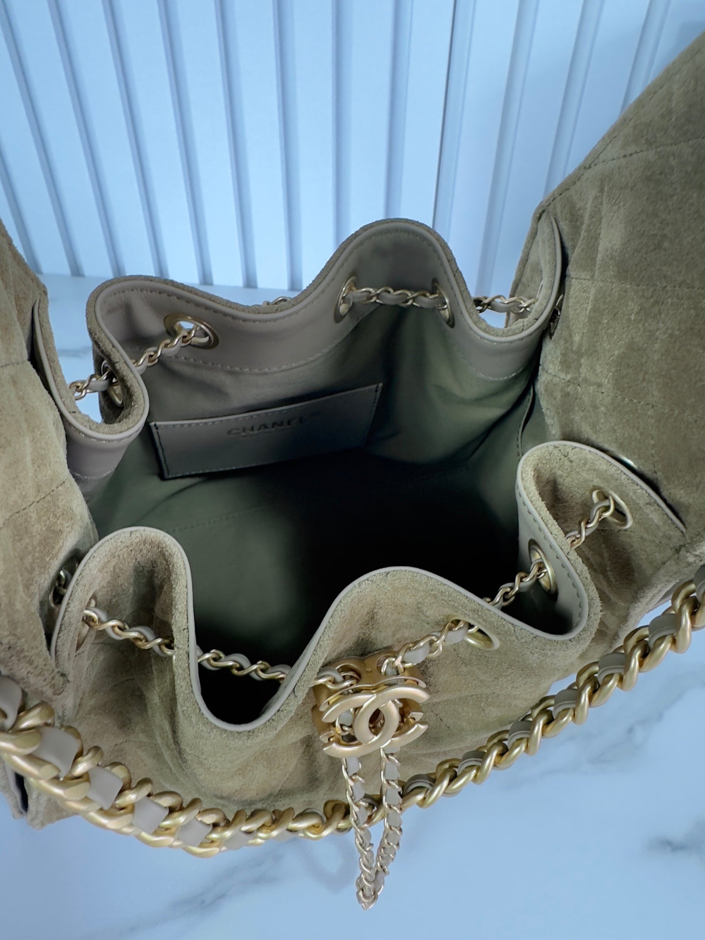 CHANEL 25b 25bag gray-green suede drawstring bucket bag small size